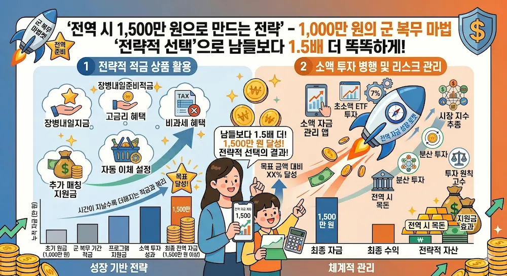 성공적인 1,000만 원 운용의 핵심은 **'군 적금 최대 활용'**과 **'목돈의 거치식 투자'**를 병행하는 이원화 전략에 있습니다. 그 구체적인 3가지 섹션을 지금 공개합니다.