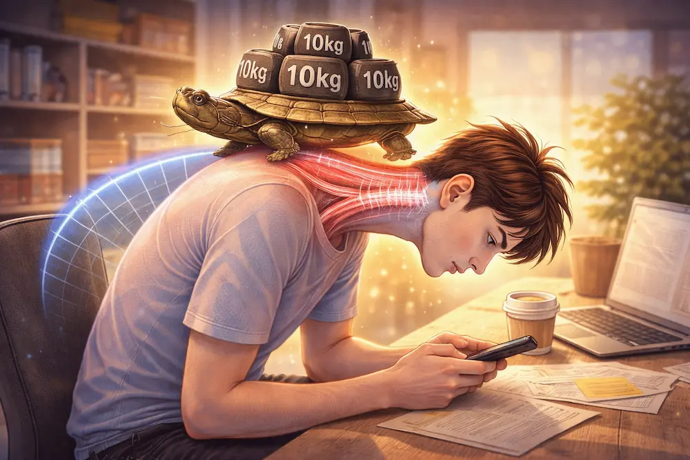 • 기전: 고개가 1인치(약 2.5cm) 앞으로 나갈 때마다 목뼈에는 약 4.5kg의 추가 하중이 실립니다.